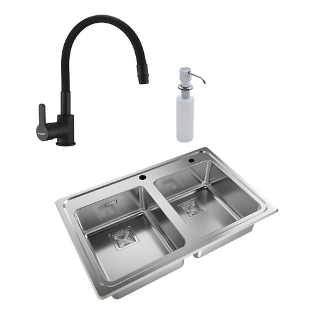 Bacha Cocina Johnson Quadra Q084Ad 83.8 X 55.9 X 17.5 Dosificador + Dosificador Johnson Std + Grifería Monocomando Piazza Emblem 10017Ne Cocina Pico Flexible Terminación Negro