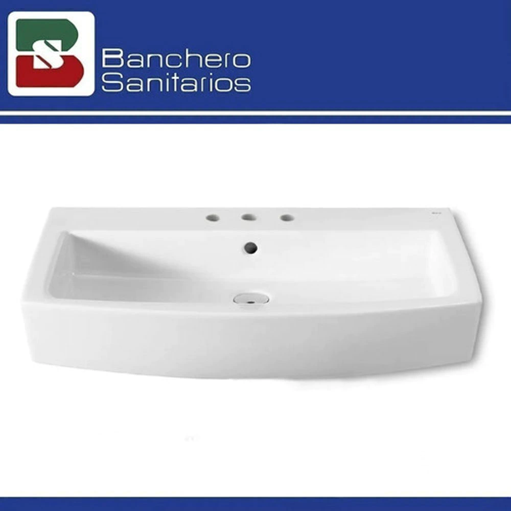 Lavatorio de porcelana suspendido o de apoyo color blanco con tres orificios para grifería, marca Rocade la colección Hall.