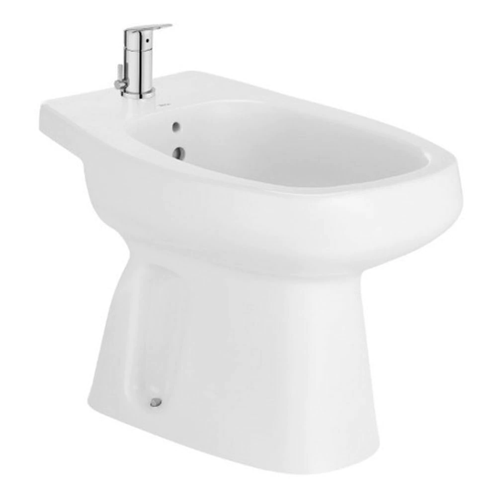 Bidet de pie lluvia con 1 orificio de porcelana sanitaria color blanco marca Roca Línea Mónaco.
