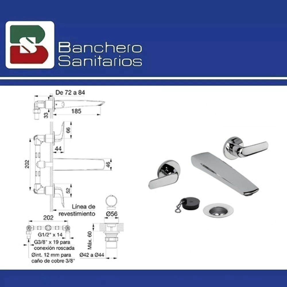 Juego para lavatorio de pared color cromo con desagüe con tapita. Marca FV de la colección Epuyén, destacada por su diseño minimalista, su durabilidad y su fácil limpieza.