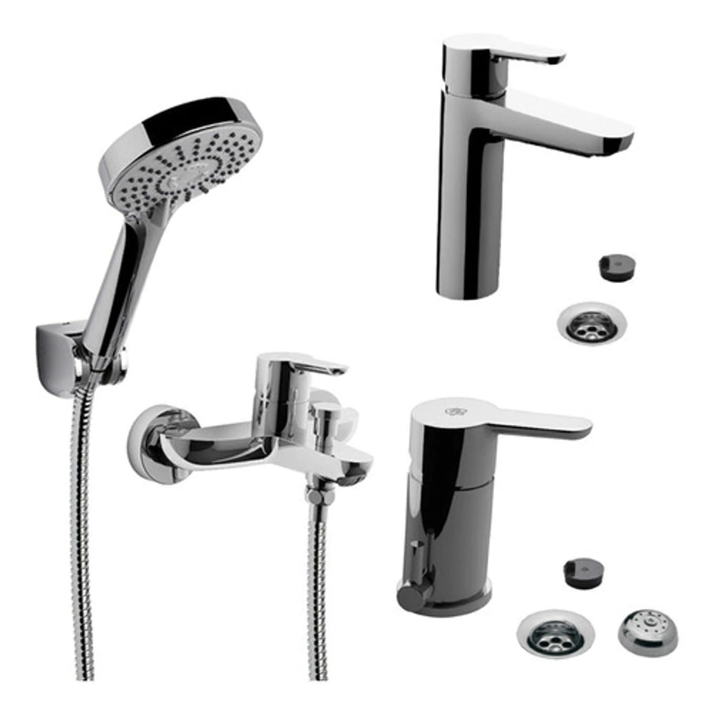 Juego monocomando para bidet color cromo con desagüe con tapita. Marca FV de la colección Puelo. Destacado por su diseño minimalista, su cierre suave, durabilidad y limpieza fácil.