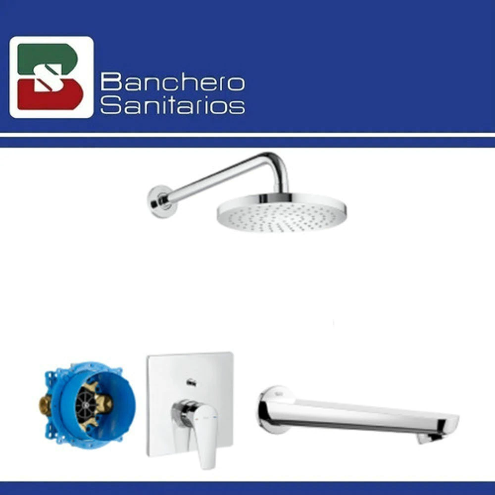 Kit empotrable para baño-ducha, con brazo de ducha 400 mm, rociador RainSense Ø200 mm y caño de bañera. Incluye RocaBox A525869403. Marca Roca de la colección Atlas