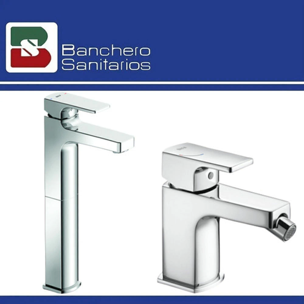 Mezclador monomando para lavatorio con caño alto y desagüe click-clack, marca Roca de la colección Escuadra. Enlaces de alimentación flexibles incluídos.