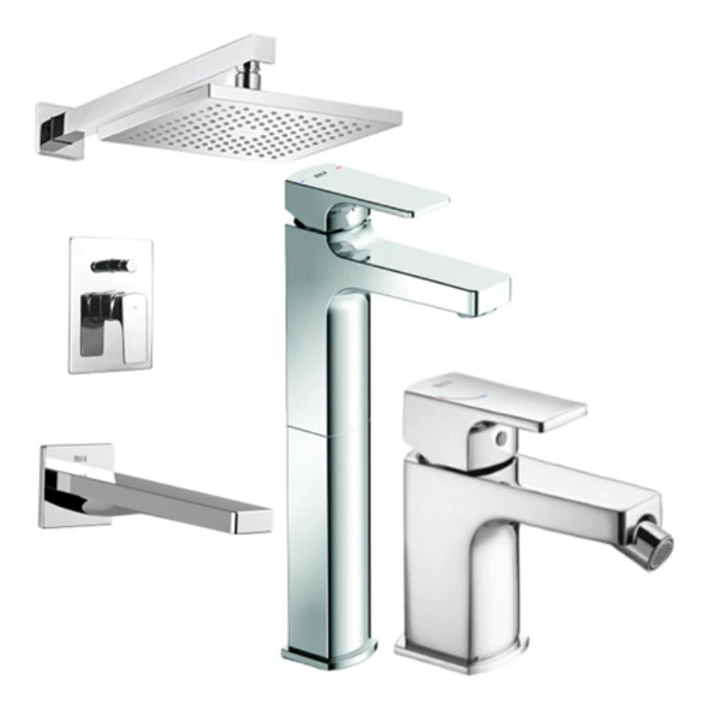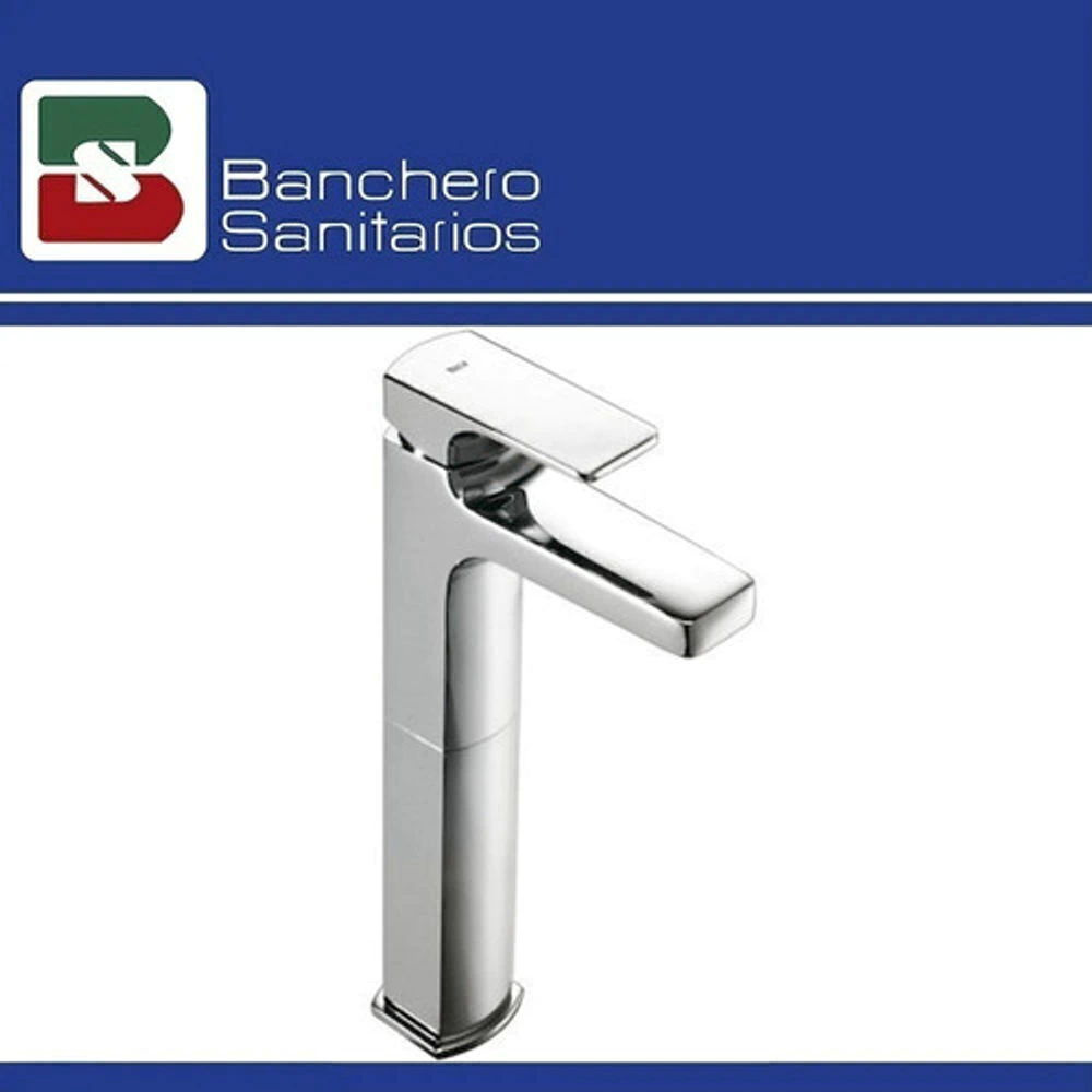 Mezclador monomando para lavatorio con caño alto y desagüe click-clack, marca Roca de la colección Escuadra. Enlaces de alimentación flexibles incluídos.