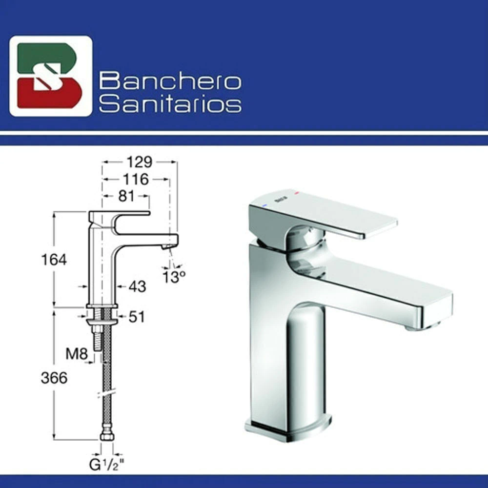 Mezclador monomando para lavatorio con cuerpo liso y desagüe click-clack, marca Roca de la colección Escuadra. Enlaces de alimentación flexibles incluídos.