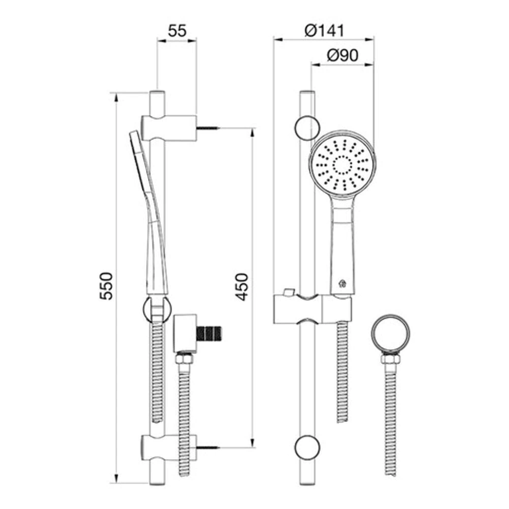 Conjunto completo de ducha manual autolimpiante función anticalcárea con barral, marca FV de la colección Polca, destacada por su durabilidad y su fácil limpieza.