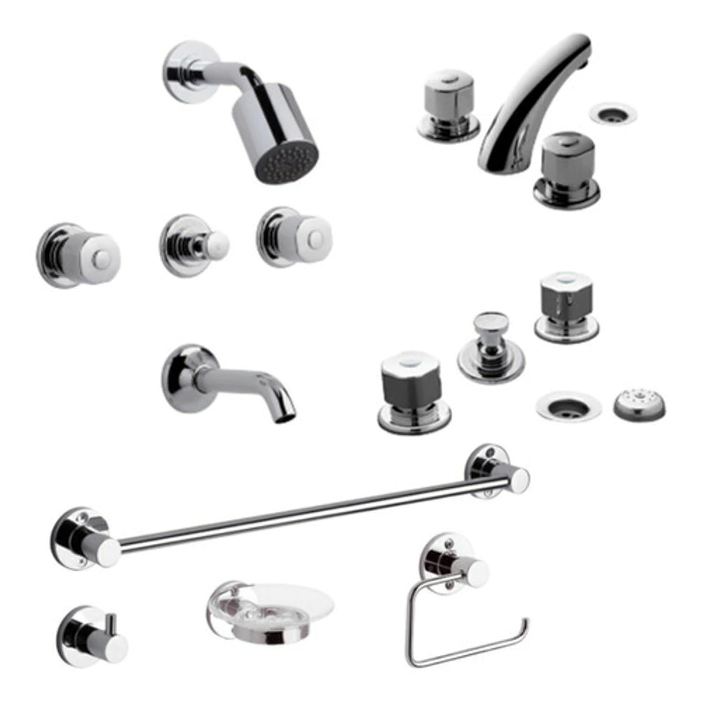 Kit de accesorios de baño 4 piezas color cromo marca FV de la colección Arizona destacados por su durabilidad y fácil limpieza.