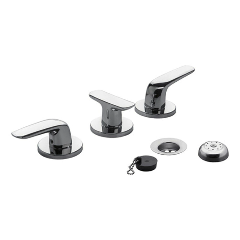 Juego para bidet, de dos llaves y transferencia. Desagüe con tapita, color cromo, durabilidad y fácil limpieza. Marca FV línea Epuyén.