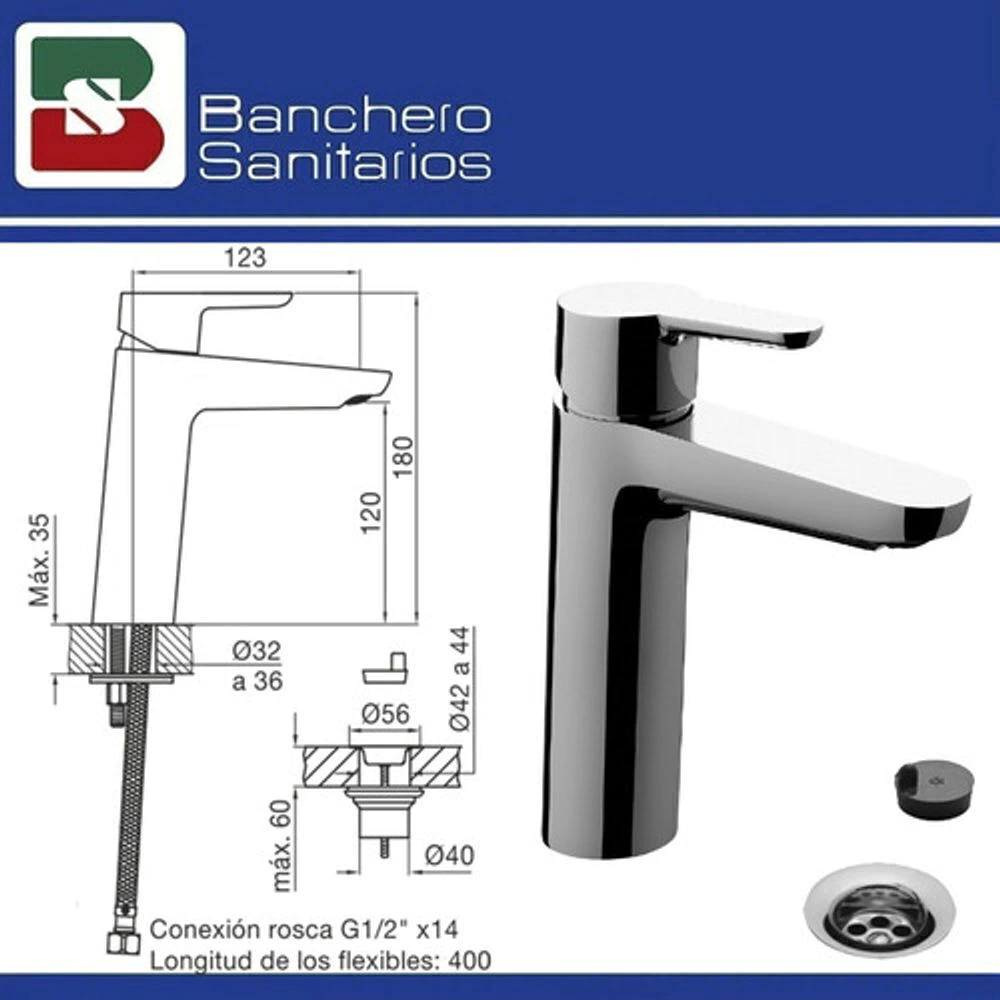 Juego monocomando para lavatorio color cromo con desagüe con tapita. Marca FV de la colección Puelo, destacada por su diseño minimalista, su durabilidad y su fácil limpieza.