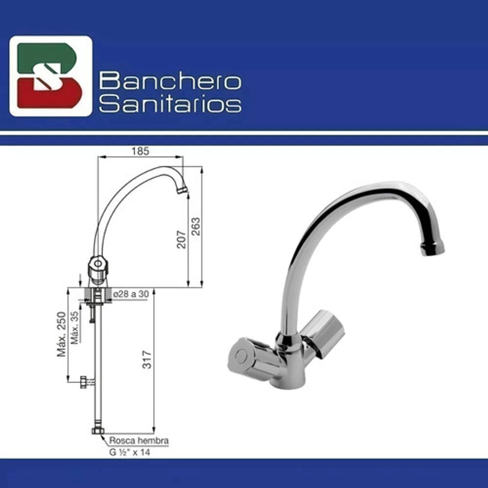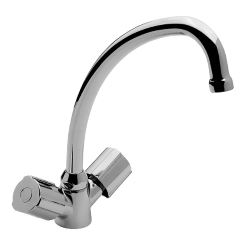 Juego compacto color cromo para mesada de cocina, con pico móvil alto. Marca FV de la colección Radal, destacada por su durabilidad y su fácil limpieza.