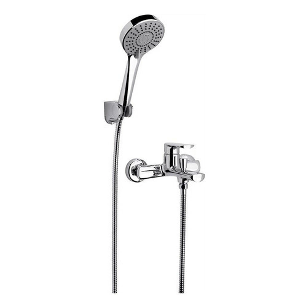 Juego monocomando exterior color cromo de pared, para bañera y ducha, con transferencia automática y ducha manual autolimpiante de 5 funciones incluída marca FV de la colección Aromo