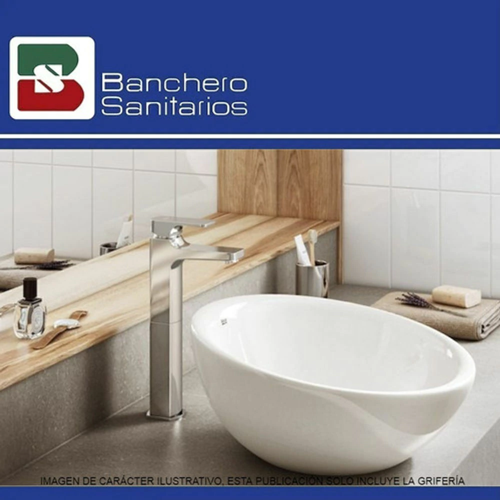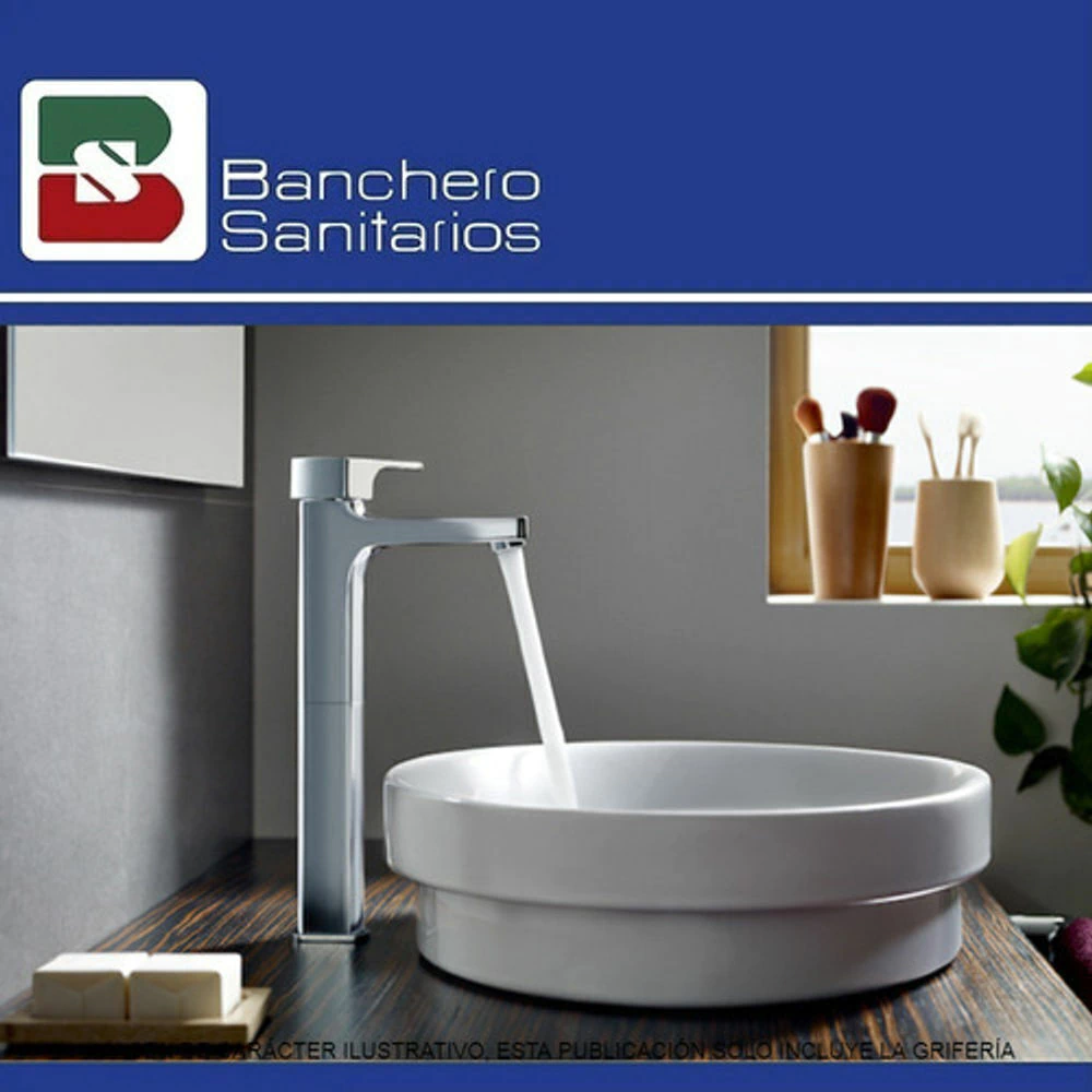 Mezclador monomando para lavatorio con caño alto y desagüe click-clack, marca Roca de la colección Escuadra. Enlaces de alimentación flexibles incluídos.