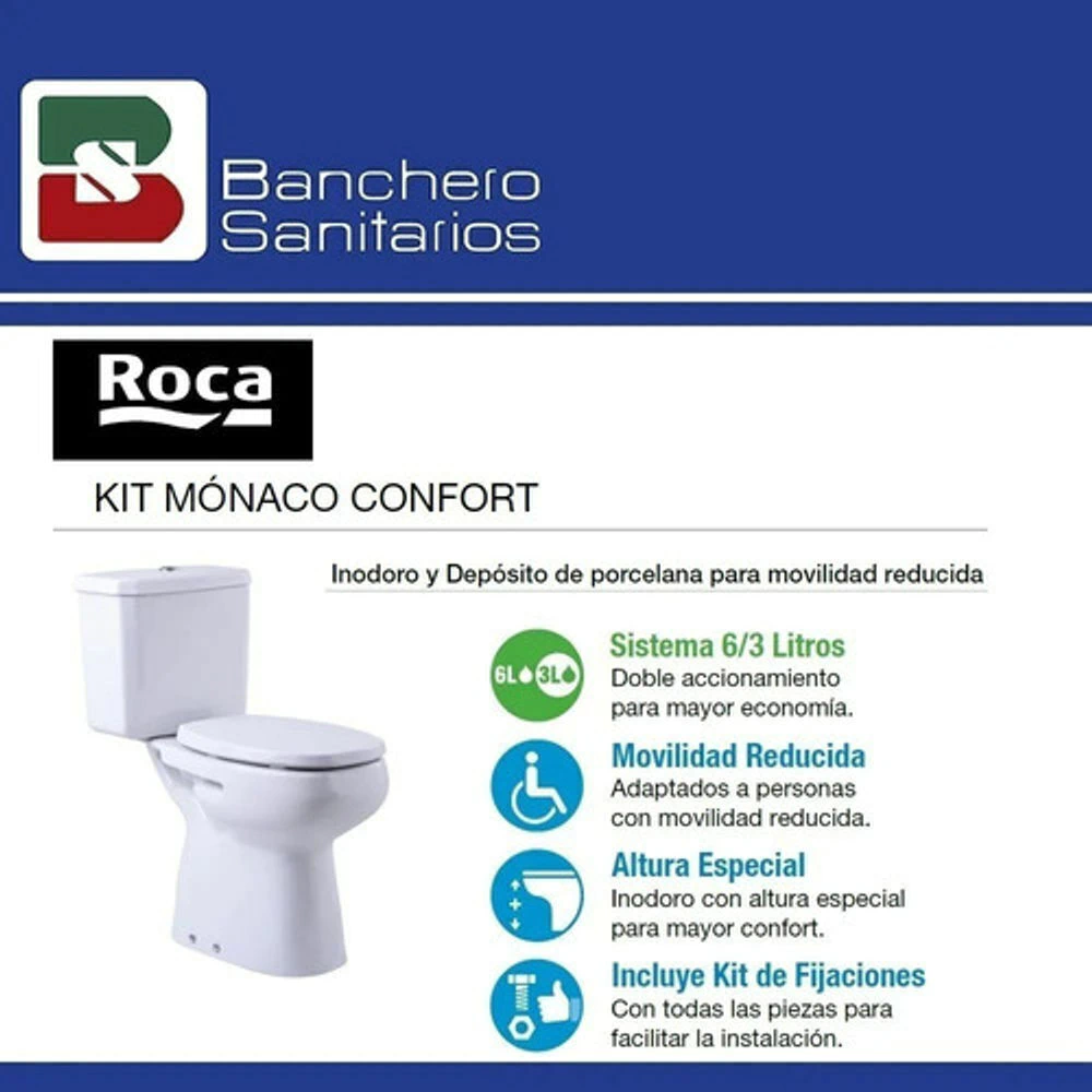 Kit Inodoro Inodoro alto de porcelana sanitaria con salida vertical + Depósito doble descarga 3/6 L + Tapa asiento, marca Roca de la colección Monaco Confort.